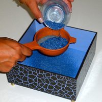 Agora, no copinho de plástico coloque o floc fácil azul cobalto claro. E no mesmo copo, acrescente o floc fácil prata, aproximadamente na mesma proporção. Misture e jogue a mistura dos pós na peneira dentro da caixa. Peneire toda a mistura, tampe a caixa, agite bem, até todo o interior ficar com o pó, abra a caixa e retire o excesso. E está pronto!